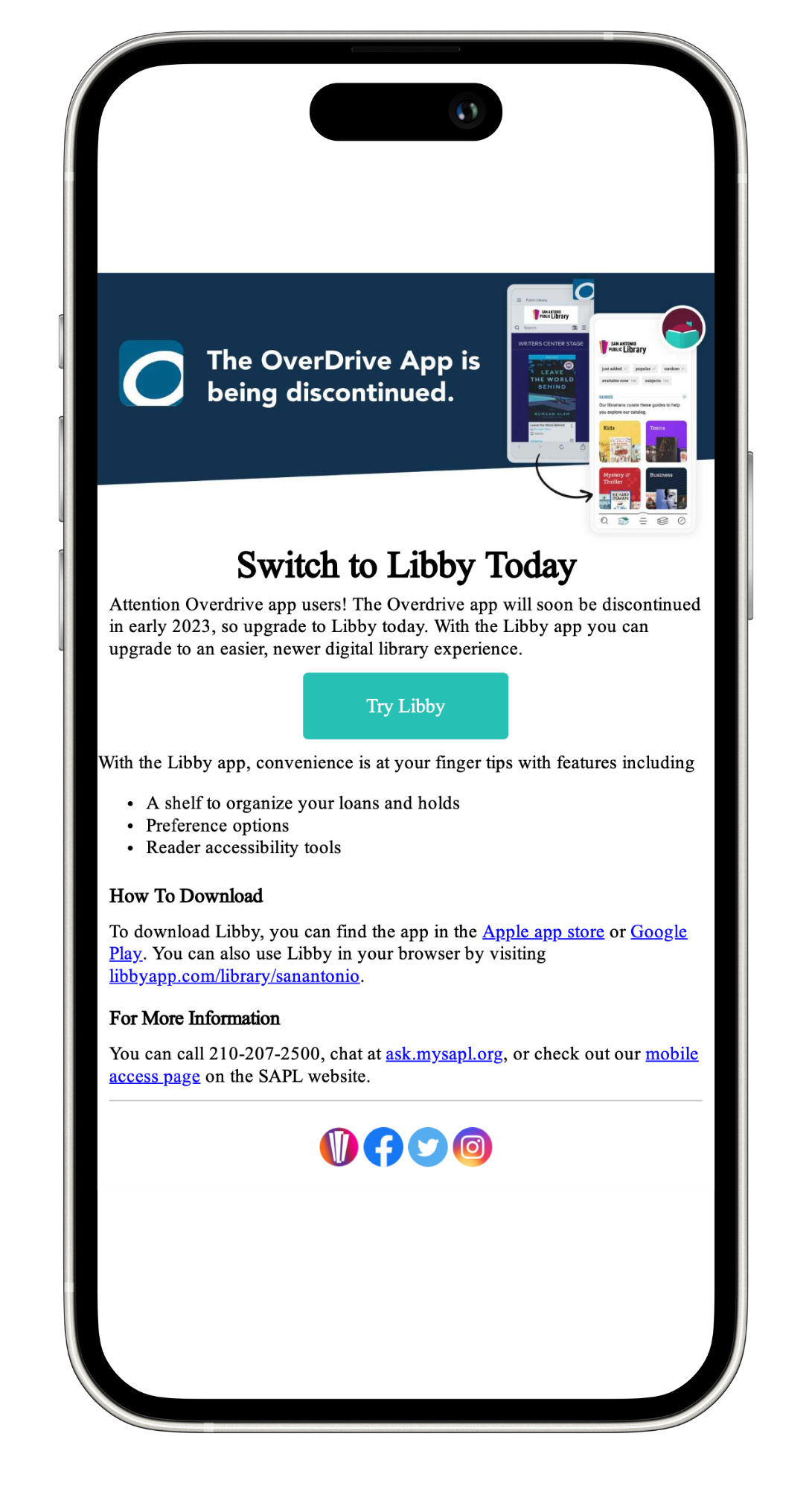 During my time as a marketing intern for the San Antonio Public Library, Central Location, I created an email campaign to increase awareness of the switch from Overdrive to Libby as SAPL's primary digital library app. We would send out one email a month to notify the library’s patrons and increase urgency about the need to switch apps. Here are a few of the emails.